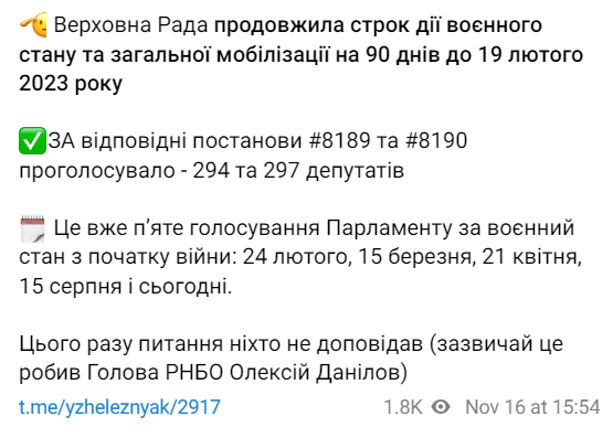 16 ноября Верховная Рада продлила срок действия военного положения и всеобщей мобилизации на 90 дней - до 19 февраля 2023 года.