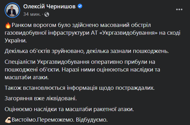 "Специалисты "Укргаздобычи" оперативно прибыли на поврежденные объекты. Ими оцениваются последствия и масштабы атаки. Также устанавливается информация о пострадавших", - сообщил Чернышев.