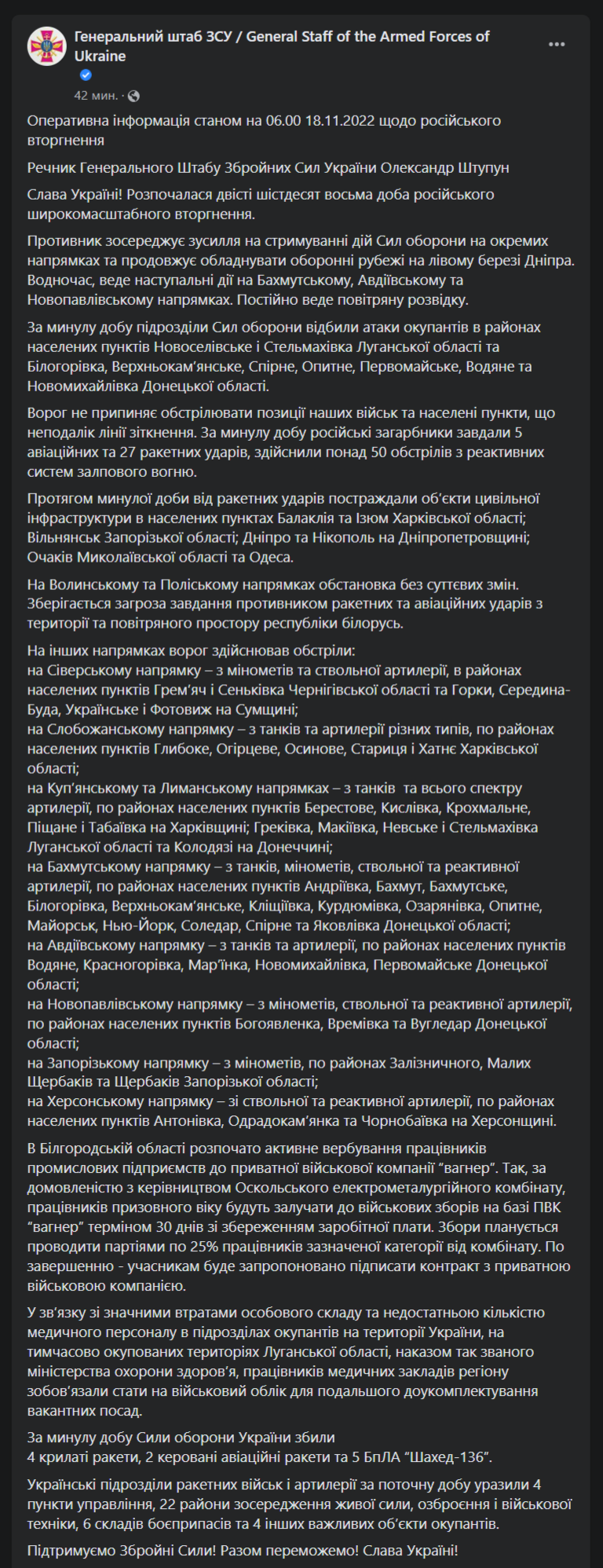 Утром в пятницу, 18 ноября, Генштаб ВСУ опубликовал актуальную сводку с фронте. Сообщается, что Вооруженные Силы Украины вчера отразили атаки россиян у населенных пунктов Новоселовское и Стельмаховка Луганской области и в районах Белогоровки, Верхнекаменского, Спорного, Опытного, Первомайского, Водяного и Новомихайловки Донецкой области.