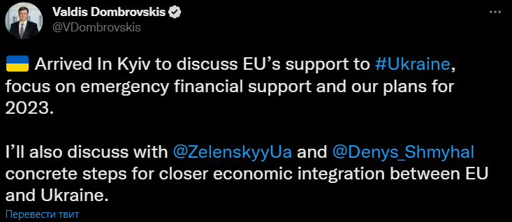 "Прибыл в Киев, чтобы обсудить поддержку ЕС для Украины, сосредоточиться на экстренной финансовой поддержке и наших планах на 2023 год", - отметил Домбровскис.