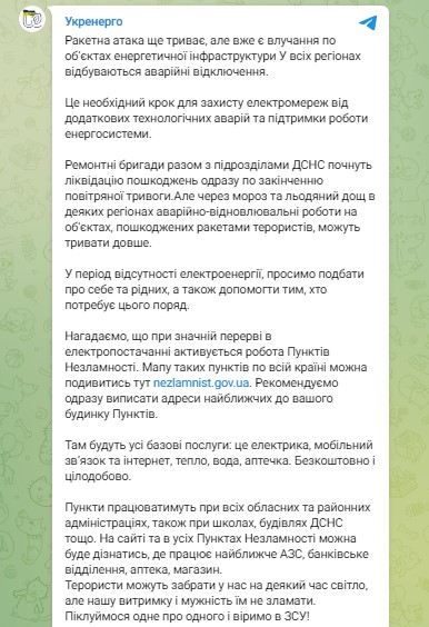 "Ремонтные бригады вместе с подразделениями ГСЧС начнут ликвидацию повреждений сразу после окончания воздушной тревоги. Но из-за мороза и ледяного дождя в некоторых регионах аварийно-восстановительные работы на объектах, поврежденных ракетами, могут продолжаться дольше", - заявляют в Укрэнерго.