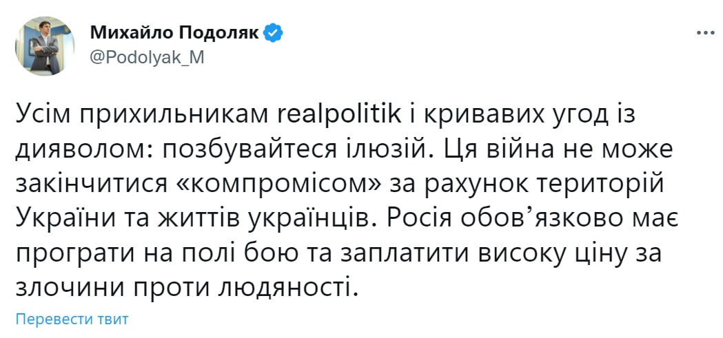 "Всем поклонникам realpolitik и кровавых сделок с дьяволом: избавляйтесь от иллюзий. Эта война не может закончиться "компромиссом" за счет территорий Украины и жизней украинцев", - написал он.
