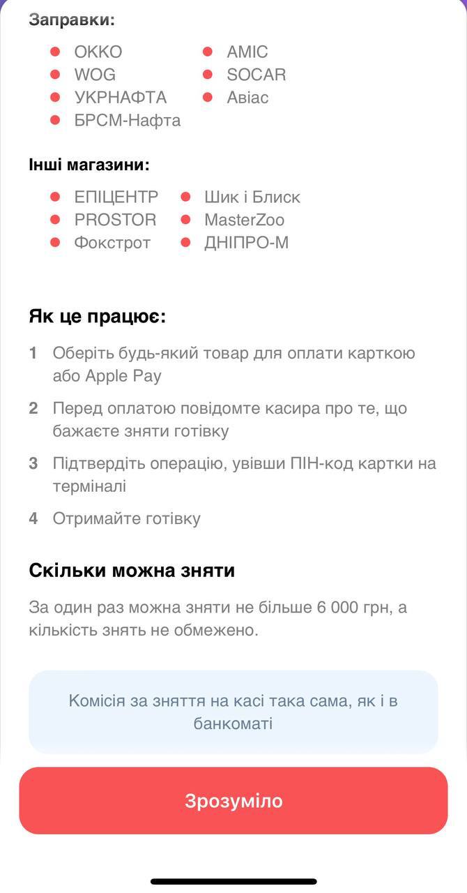 Уточняется, что за один раз можно снять на больше 6 тысяч гривен, при этом количество снятий не ограничено.