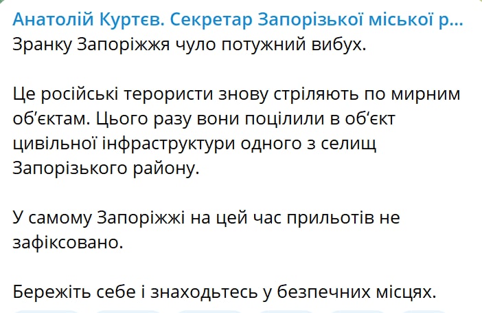 08.19 Секретарь горсовета Запорожья пишет, что был удар по объекту инфраструктуры в одном из поселков поблизости от областного центра.