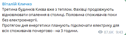 В течение дня энергетики планируют подключать электричество для всех потребителей поочередно – на 3 часа, пишет в своем телеграм-канале Кличко.
