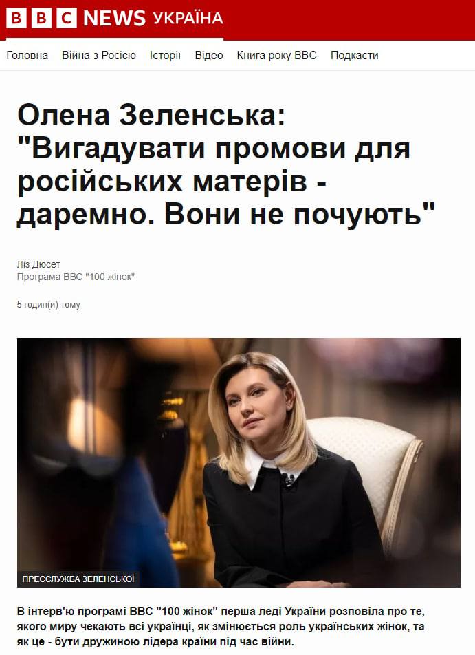 BBC записала большое интервью с Еленой Зеленской. В нем она озвучила свое мнение по поводу войны, перспективы общения с российскими матерями и своем выступлении в Конгрессе США.