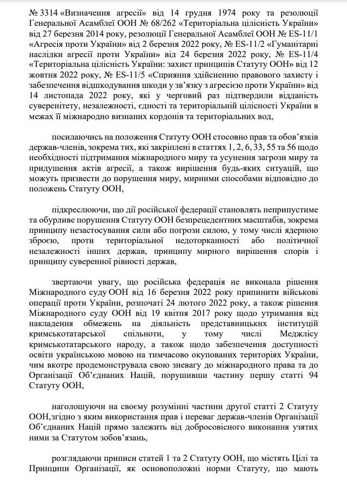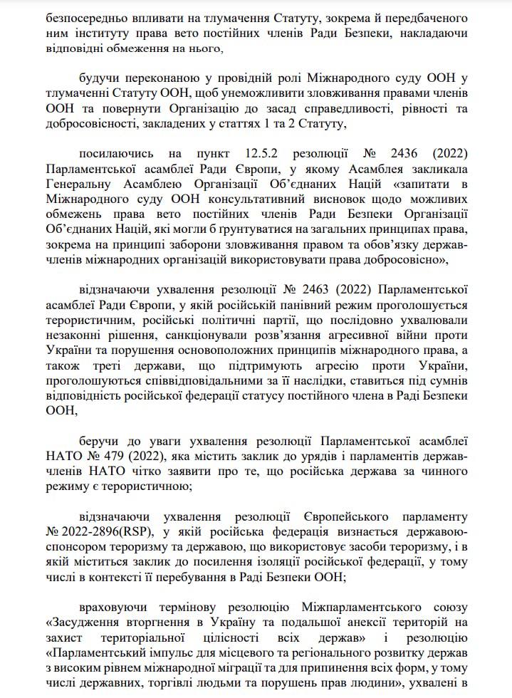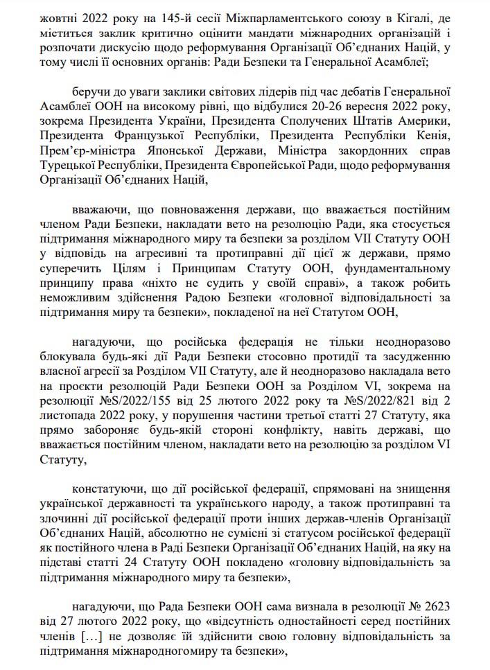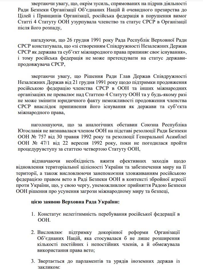 В нем, в частности, мировые парламенты призывают "принять меры для немедленного отстранения российской федерации (правописание согласно с оригиналом проекта - Ред.) от использования прав и обязанностей, которые проистекали из членства СССР в ООН".