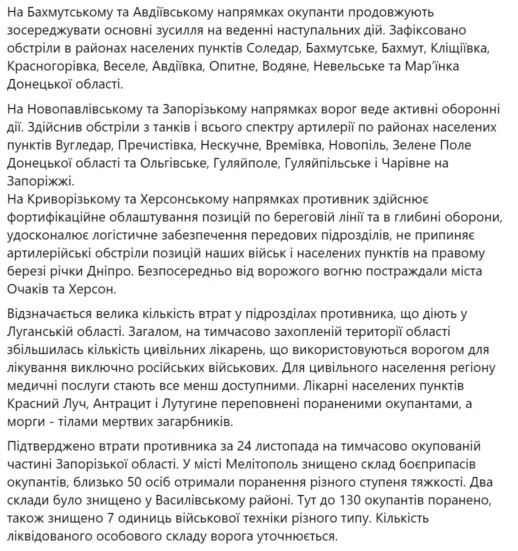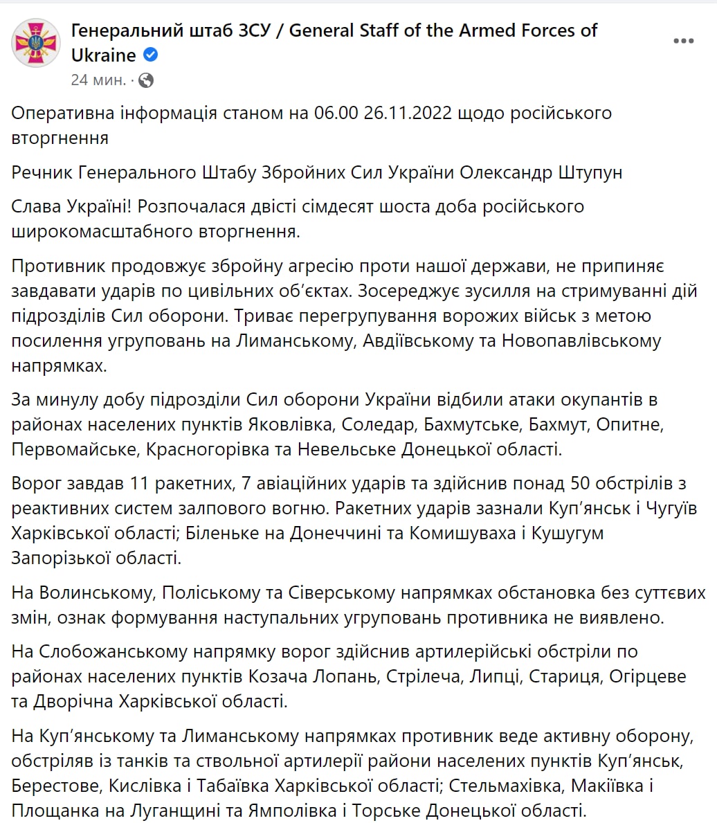 Украинский Генштаб публикует оперативную информацию по российскому вторжению на утро 26 ноября, когда начались 276 сутки широкомасштабного вторжения РФ в Украину.