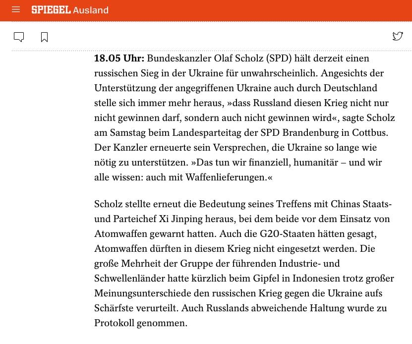 22:57 Канцлер Германии Шольц заявил, что все более очевидным становится, "что Россия не только не должна выиграть эту войну, но и не выиграет ее".