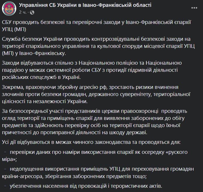 "При непосредственном участии представителей церкви правоохранители проводят осмотр территории и помещений епархии для выявления запрещенных к обращению предметов и проверяют лиц на территории епархии относительно их причастности к противоправной деятельности в ущерб государству", - говорится в сообщении.