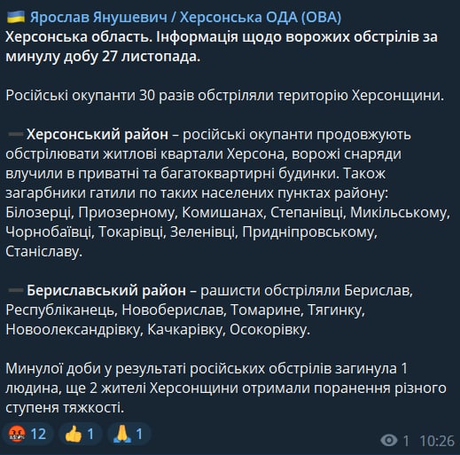 Херсонскую область обстреляли 30 раз за сутки, есть погибшие и раненые