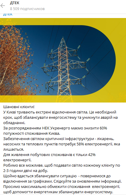 "По распоряжению НЭК Укрэнерго должны снизить 60% мощности потребления Киева. Обеспечение светом критической инфраструктуры - больниц, насосных и тепловых пунктов - требует 58% остающейся электроэнергии. Для питания бытовых потребителей имеется только 42% электроэнергии. Делаем все возможное, чтобы давать свет каждому клиенту по 2-3 часа дважды в сутки. Как только удастся сбалансировать ситуацию – вернемся к отключению по графикам", - говорится в сообщении ДТЭК.