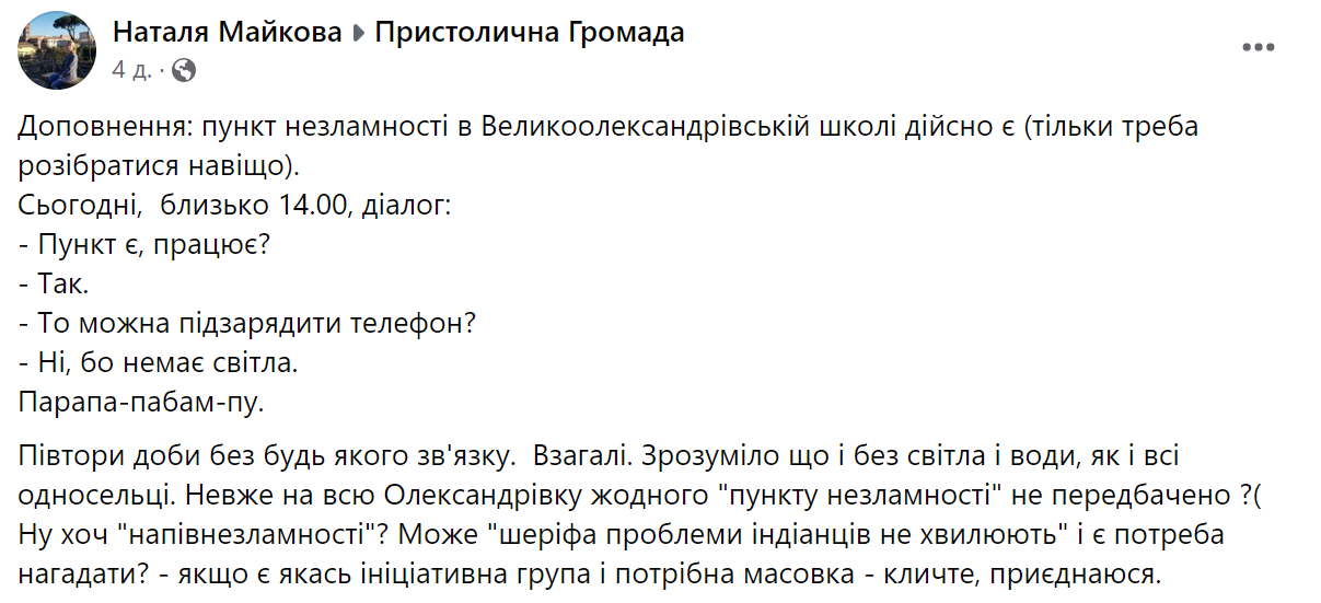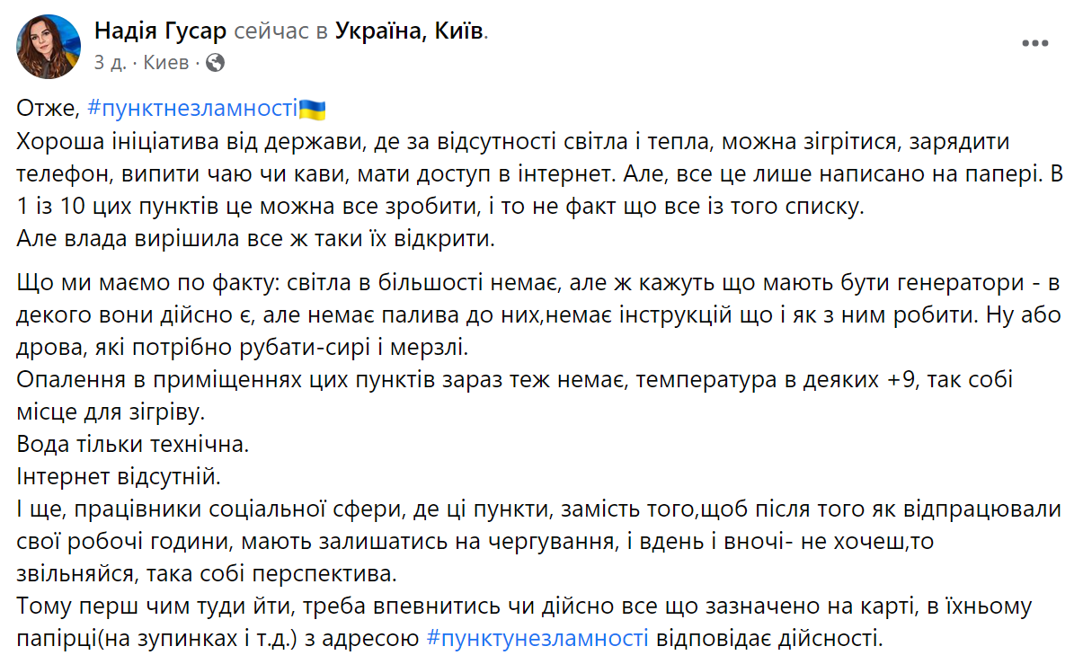 Еще одна киевлянка, Надежда Гусар, пишет о своих впечатлениях по поводу "пунктов". Судя из ее слов, на некоторых пунктах вместо генераторов используются печи-буржуйки.