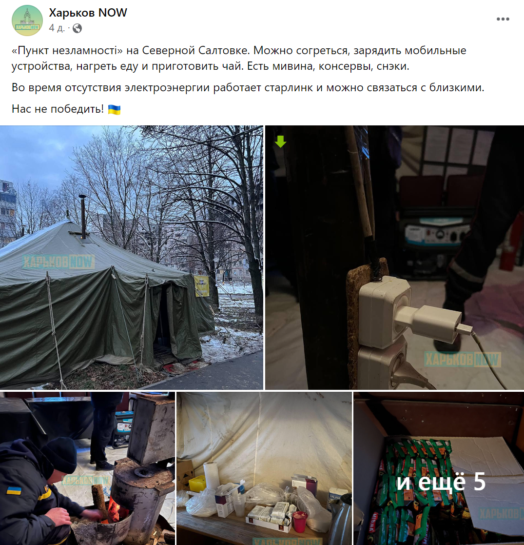 При этом в городах покрупнее "пункты незламности", судя по всему, оборудованы получше. Так, одна из палаток на Северной Салтовке в Харькове имеет и генератор, и буржуйку, и даже "Старлинк".