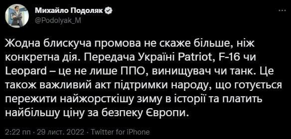 "Никакая блестящая речь не скажет больше, чем конкретное действие. Передача Украине Patriot, F-16 или Leopard – это не только ПВО, истребитель или танк. Это также важный акт поддержки народа, который готовится пережить жесточайшую зиму в истории и платит наибольшую цену за безопасность Европы", - написал Подоляк в Twitter.