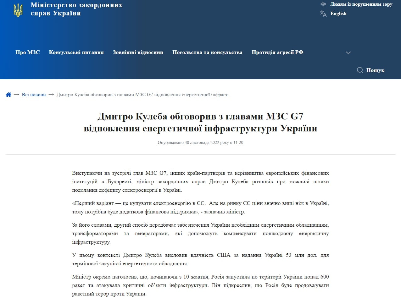 12.15 Глава МИД Украины в разговоре с главами МИД G7 назвал два пути преодоления энергокризиса в Украине.