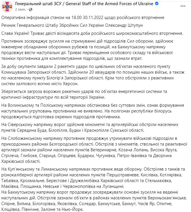 В среду, 30 ноября, в Украине идет уже 280-й день войны с РФ.