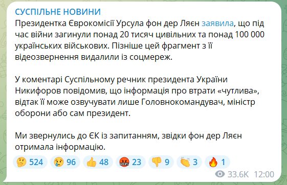 Из видеообращения главы Еврокомиссии вырезали заявление о гибели 100 тысяч украинских военных