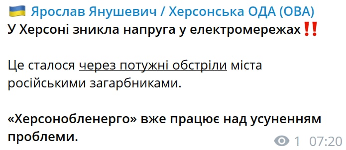 08:21 В Херсоне власти подтвердили отключение света из-за обстрелов, которые произошло этой ночью.