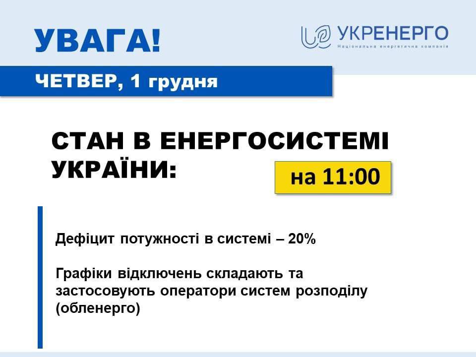 11.35 Укрэнерго в своём телеграмм-канале полчаса назад опубликовало сообщение о состоянии энергосистемы Украины. Из него следовало, что дефицит энергомощностей снизился до 20% (вчера он был 27%).