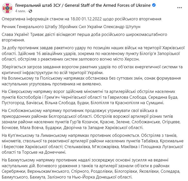 В четверг, 1 декабря, в Украине идет уже 281-й день войны с РФ.