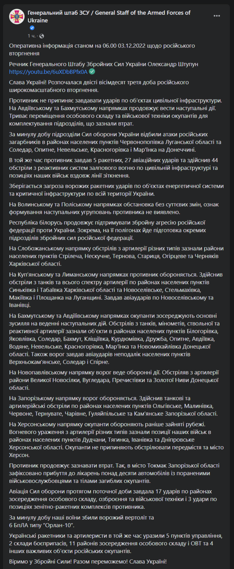 08:20 Сводка украинского Генштаба на утро 3 декабря. Главное: