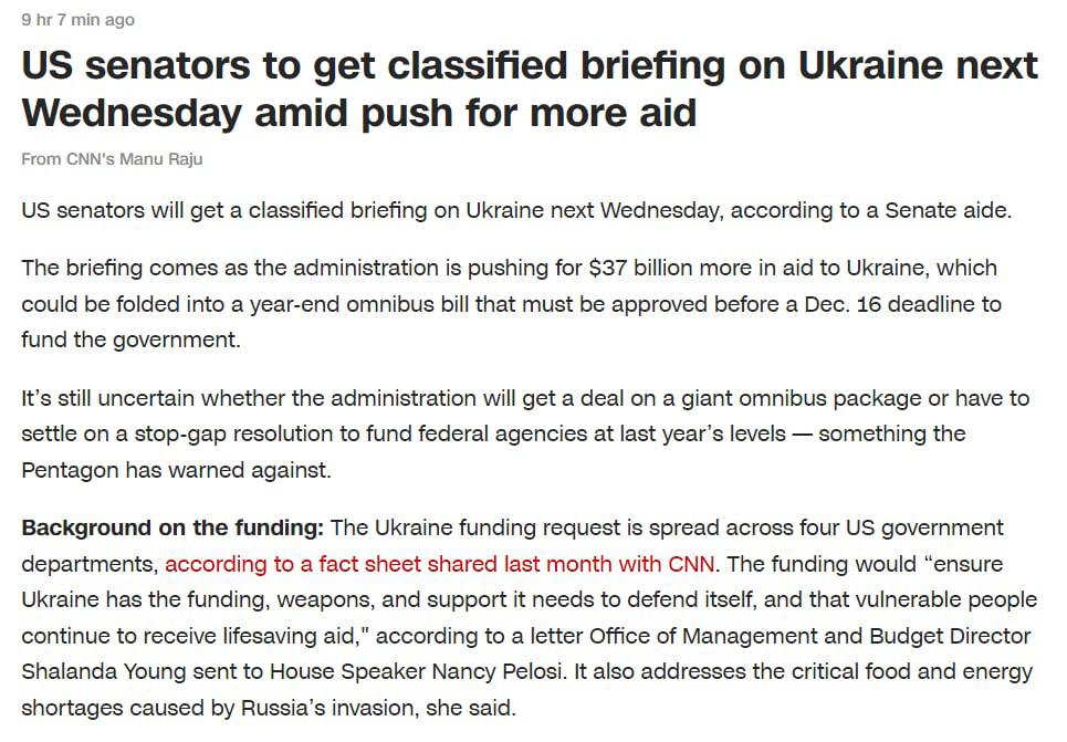 Администрация Байдена настаивает на выделении Украине помощи на 37 миллиардов долларов. Они могут быть включены в общий законопроект о дополнительном финансировании, который должен быть утвержден до 16 декабря. Но с законопроектом есть проблемы, причем никак не связанные с Украиной - например, по вопросу о финансировании федеральных агентов.