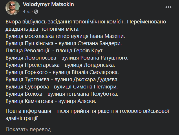 Кроме того, улица Московская стала улицей Ивана Мазепы, площадь Революции - площадью Героев Крут, улица Ломоносова - улицей Романа Ратушного, улица Пролетарская - Лондонской, улица Горького - улицей Виталия Смолярова, улица Тургенева - улицей Джохара Дудаева, улица Волоха - улицей гетмана Полуботка.