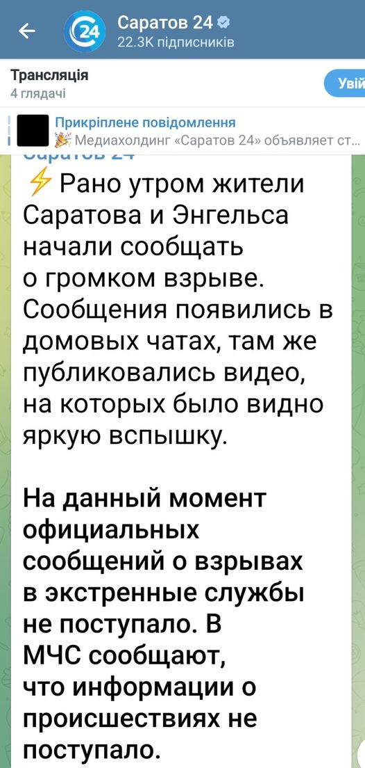 Между тем, российские телеграм-каналы опубликовали новые видео взрыва на саратовском аэродроме "Энгельс", где базируется стратегическая авиация РФ. На кадрах видна яркая вспышка.