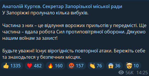 "В Запорожье прозвучало несколько взрывов. Часть из них – эхо вражеских прилетов в пригороде. Еще часть – удачная работа сил противовоздушной обороны. Будьте внимательны! Существует возможность повторной атаки. Берегите себя и находитесь в безопасных местах", - написал Куртев.