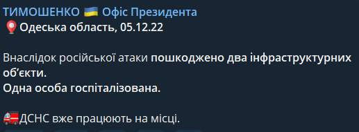 "В результате российской атаки повреждены два инфраструктурных объекта. Один человек госпитализирован. ГСЧС уже работают на месте", - сообщил Тимошенко.