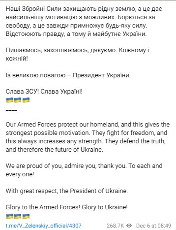 "Наши Вооруженные Силы защищают родную землю, что дает самую сильную мотивацию из возможных. Сражаются за свободу, а это всегда умножает всякую силу. Отстаивают правду, а потому и будущее Украины.