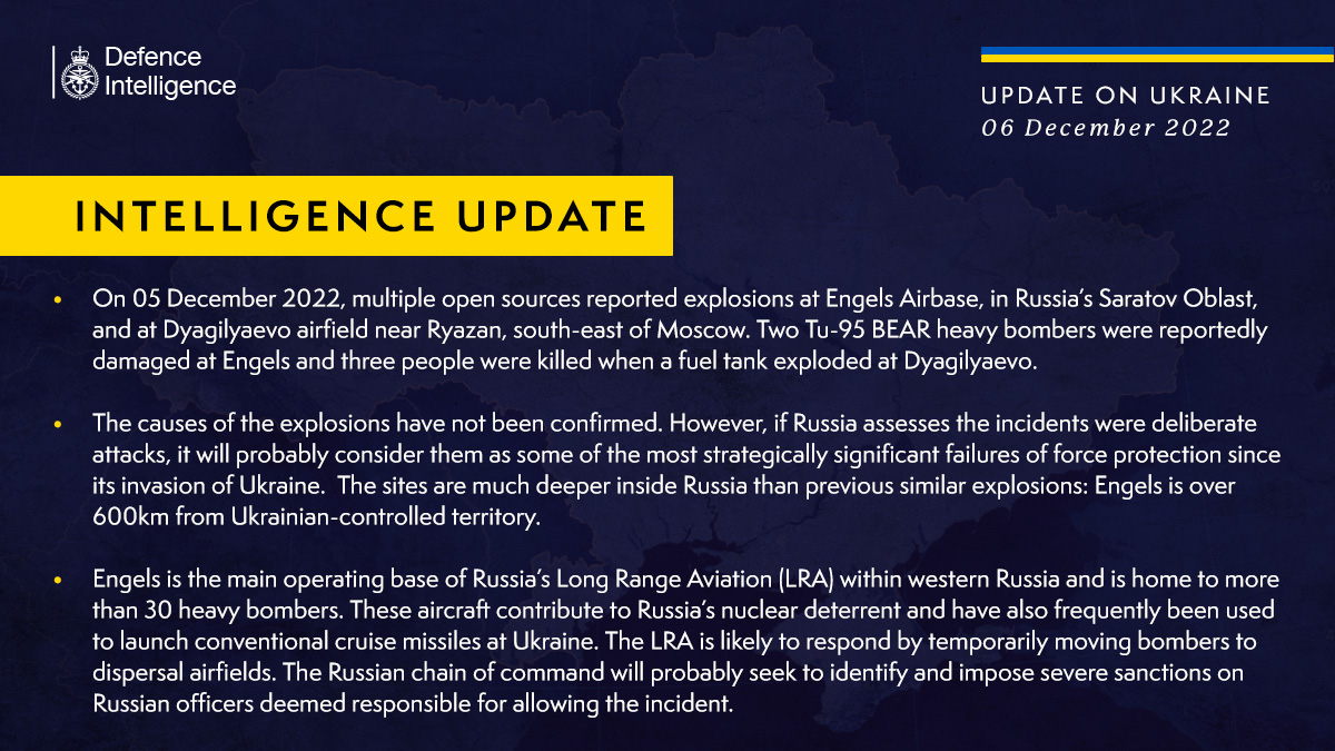 В британской разведке полагают, что РФ, вероятно, отреагирует, временно перебросив бомбардировщики АДД на аэродромы рассредоточения, а российское командование, вероятно, попытается выявить и применить суровые санкции к российским офицерам, считающимся ответственными за допущение инцидента.