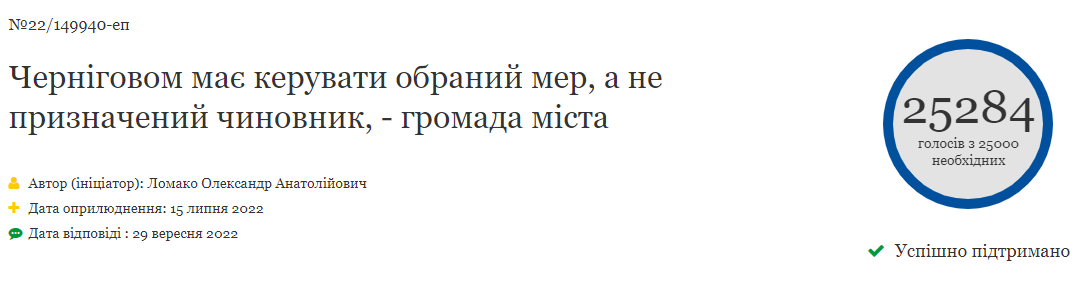 Между тем на сайте президента Украины петиция с требованием прекратить политическое давление на черниговского мэра за два месяца собрала более 25 тыс. голосов, теперь ее должен рассмотреть Владимир Зеленский.