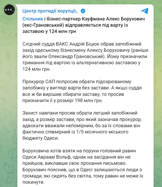 Напомним, Национальное антикоррупционное бюро (НАБУ) проводило масштабные обыски, итогом которых стали задержания крупных местных бизнесменов Бориса Кауфмана и Александра Грановского. После сообщалось, что их задержали. Предварительная квалификация дела - часть 1 ст. 255 и часть 3 ст. 369 УК Украины.