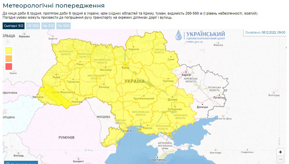 Из-за тумана возможно ухудшение движения транспорта на отдельных участках дорог и улиц. Из-за этого по всей стране, кроме Харьковской, Луганской, Донецкой областей и Крыма, объявили І уровень опасности (желтый)