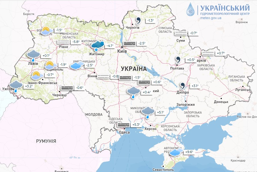 По прогнозам синоптиков, температура воздуха в Украине составит от -1 до +5 градусов. В части западных и южных областей возможен дождь.