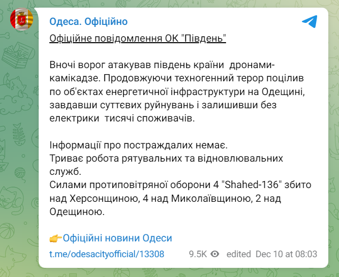 "Ночью враг атаковал юг страны дронами-камикадзе. Продолжая техногенный террор попал по объектам энергетической инфраструктуры в Одесской области, нанеся существенные разрушения и оставив без электричества тысячи потребителей. Информации о пострадавших нет", - говорится в сообщении.