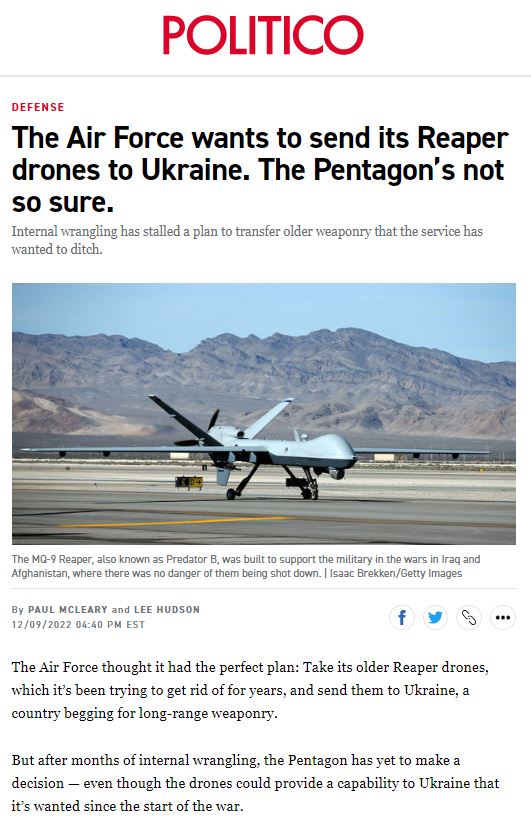 Идея отправить Reaper Киеву принадлежит представителям ВВС США. Они уже несколько лет не знают, куда деть старые машины, отмечает Politico. И тут подоспел запрос Украины на дальнобойное вооружение.