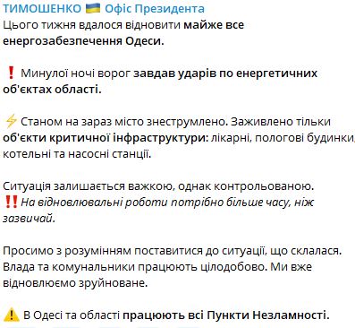 В Офисе президента дали прогноз по возобновлению электроснабжения Одесской области после ночной атаки РФ