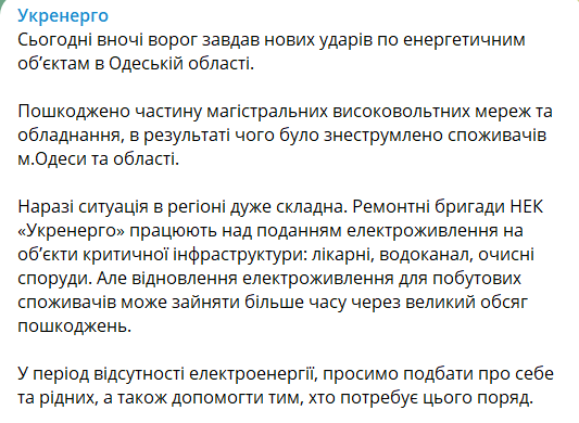 "Повреждена часть магистральных высоковольтных сетей и оборудования, в результате чего были обесточены потребители Одессы и области. Пока ситуация в регионе очень сложная", - говорится в обращении.