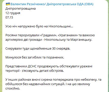 По Днепропетровской области ночью 12 декабря россияне выпустили не менее 30 снарядов.