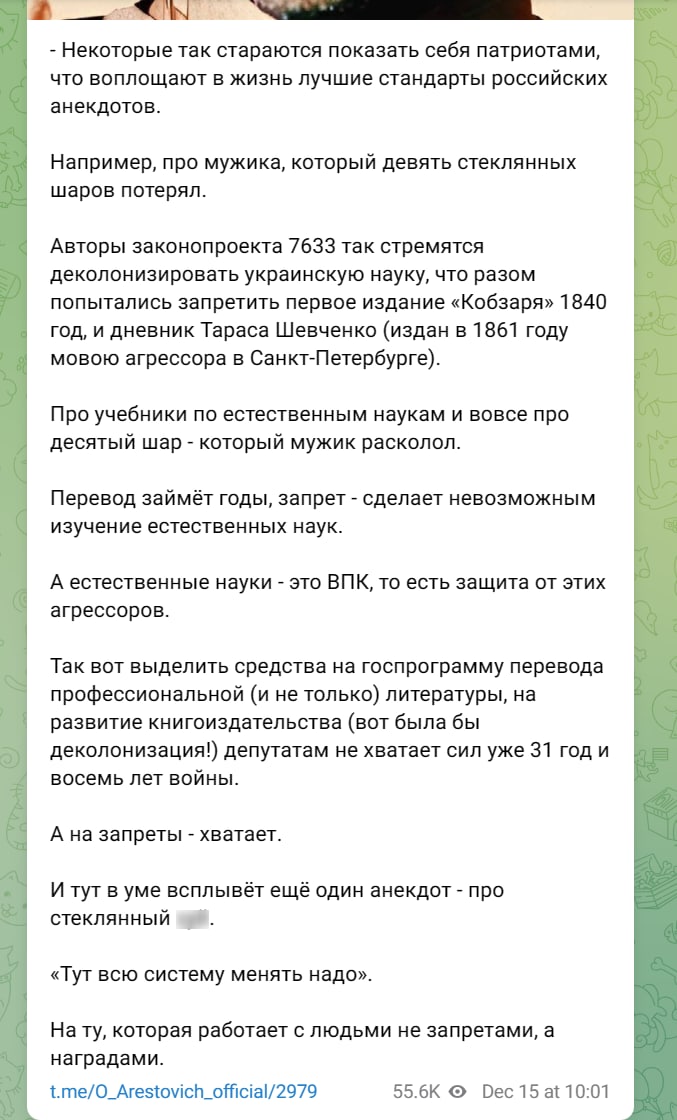Советник Офиса президента Алексей Арестович раскритиковал законопроект, запрещающий использовать в науке и образовании книги на русском языке (в том числе переводные) и делать ссылки на них.