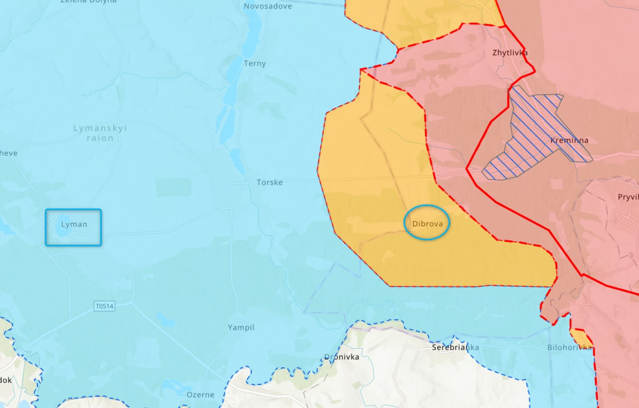 О какой Диброве речь - Громов не уточнил, но, судя по всему, речь о селе под Кременной (также известно как Червоне Диброво), которое на западных картах пока значится как территория под контролем россиян. Но в сводках Генштаба за эти сутки о таком продвижении не говорится.