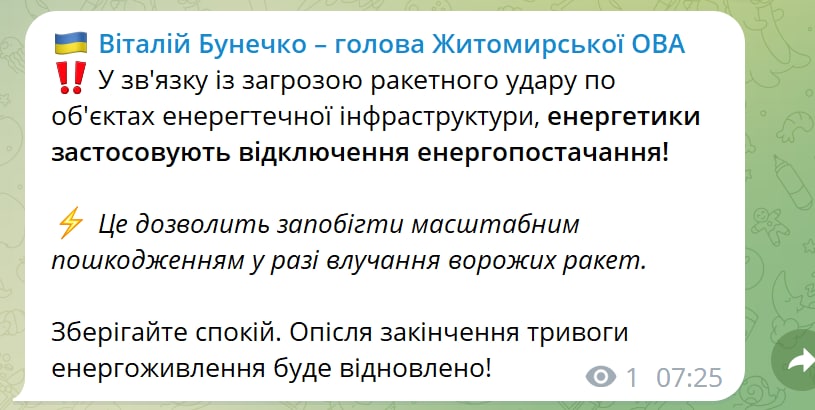 Так, в Житомирской области еще до ракетных ударов начали отключать свет. Как заявил губернатор Виталий Бунечко, чтобы избежать масштабных повреждений в случае попаданий.