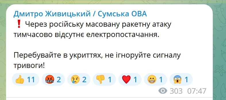 Сумские власти тоже заявили об отключении света на случай российских ударов.