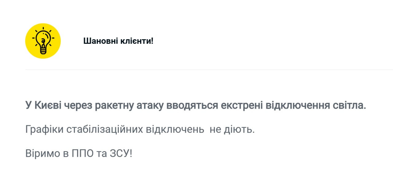 На данный же момент, согласно сообщению, в Киеве, Киевской, Черниговской, Житомирской и Черкасской областях из-за повреждений энергосистемы применены более существенные ограничения электроснабжения, чем обычно.