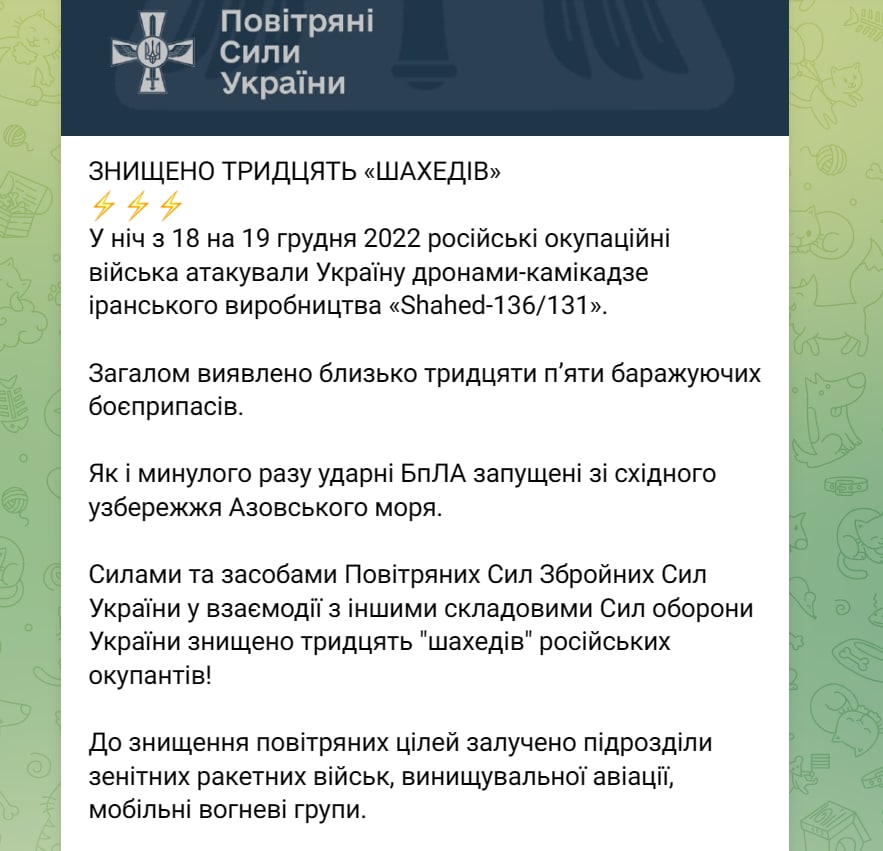 Как сообщают военные, они сбили 30 беспилотников (то есть, пять достигли своих целей).
