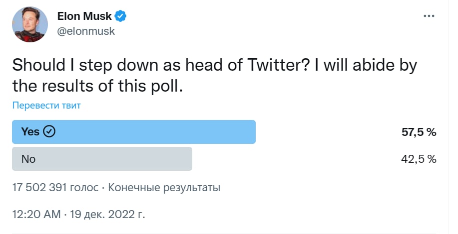 14.11 Закончился опрос Илона Маска о том, нужно ли ему дальше руководить Твиттером.