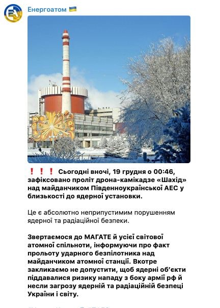 14.30 Энергоатом заявляет, что во время ночной атаки дронами один "Шахид" пролетел над площадкой Южноукраинской АЭС недалеко от ядерной установки.